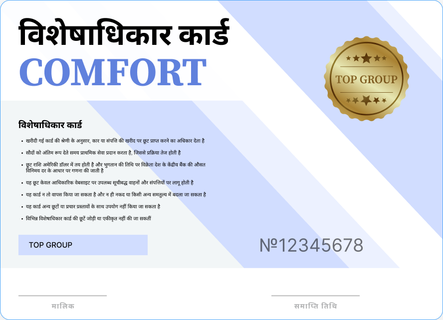 कार या अपार्टमेंट खरीदना एक महत्वपूर्ण निवेश है, और हर कोई चाहता है कि यह सबसे लाभदायक हो। प्रिविलेज कार्ड आपको विशेष छूट और फायदेमंद ऑफ़र की सुविधा देकर बड़ी बचत करने में मदद करता है। अपने अनुभव को दोस्तों और परिचितों के साथ साझा करें और हमारे रेफ़रल प्रोग्राम के ज़रिए अच्छा खासा मुनाफ़ा कमाएं। जब आप दूसरों को बड़ी खरीदारी में बचत करने में मदद करते हैं, तो आप भी उल्लेखनीय कमाई कर सकते हैं।
